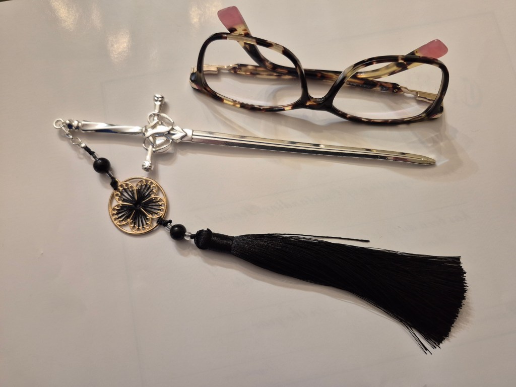 It’s a metal sword bookmark; the winner will be able to choose a black, red, or green tassel. Isn’t it gorgeous??? (The glasses are for scale, the sword measures about 8″ (20 cm) long.)