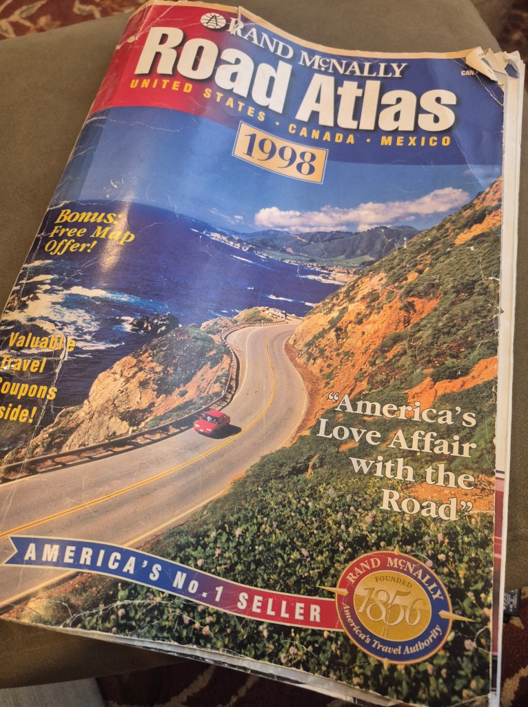 That’s why I keep a paper atlas. (Does Rand McNally even exist anymore? Quick check, yes they do, they’ve adapted to technology but still make atlases. See, dinosaurs have their use.) You can see the wear and tear because I use it for almost every book.